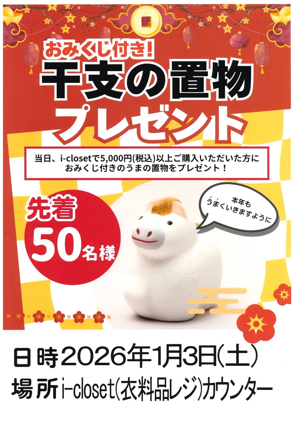 1月3日(土)、アイ・クローゼット売場でのお買い物5,000円(税込)以上で「おみくじ付き!干支の置物」プレゼント!先着50名様でなくなり次第終了です。