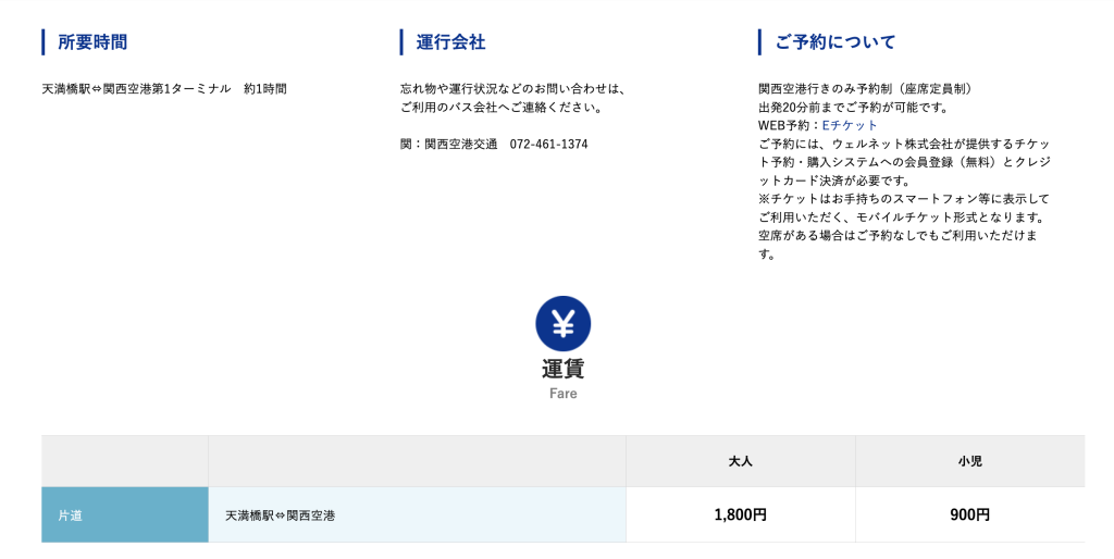 関西空港交通株式会社の公式サイトによると、片道料金は大人1,800円・小児900円で、所要時間は約1時間ほどとのこと。関西空港行きのみ予約制なんだとか。