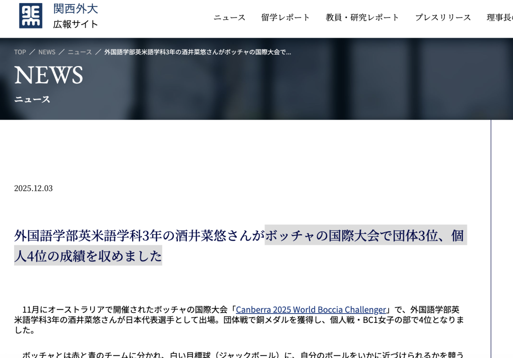 関西外国語大学の公式発表によると、酒井さんは11月にオーストラリアで開催された国際大会「Canberra 2025 World Boccia Challenger」に、日本代表選手として出場。