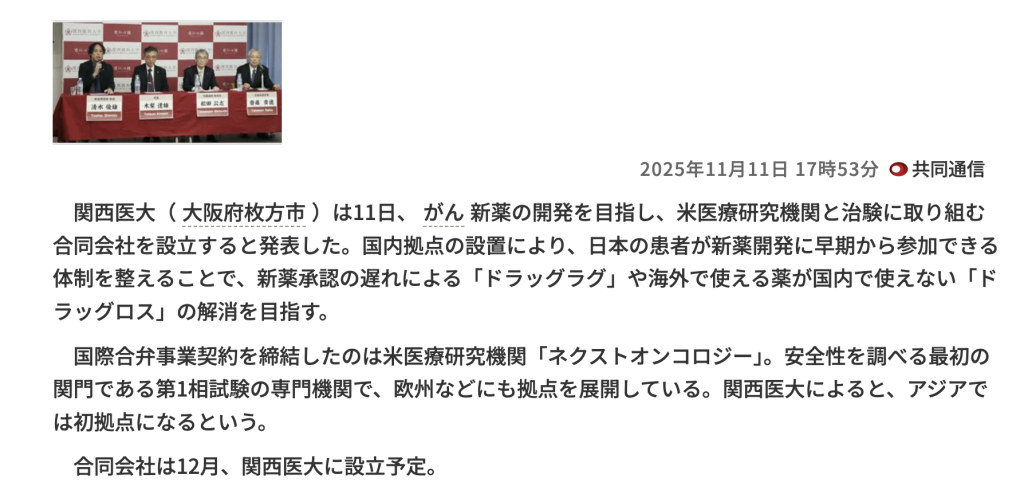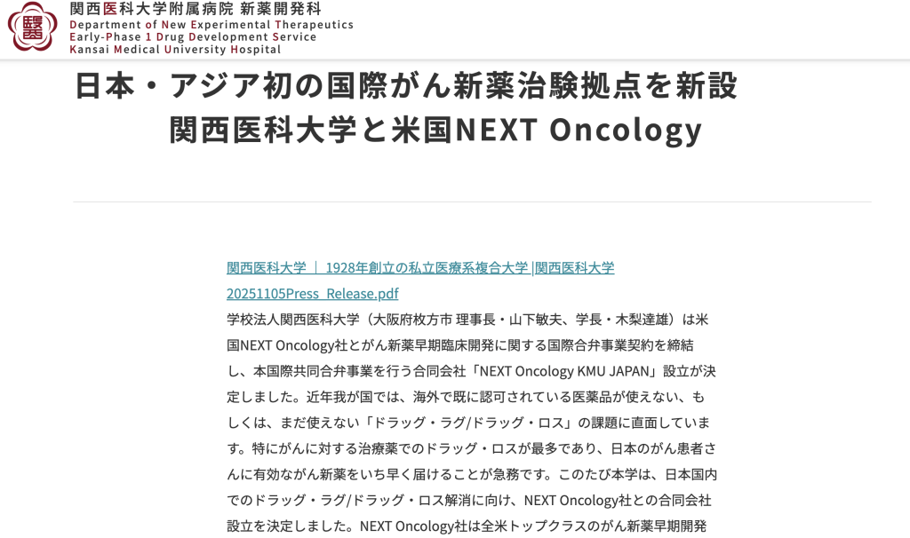 「関西医科大学附属病院 新薬開発科」公式サイトのお知らせのページを見てみると、関西医大がアメリカの医療研究機関「NEXT Oncology社」との合同会社「NEXT Oncology KMU JAPAN」設立が決定したということが書かれています。
