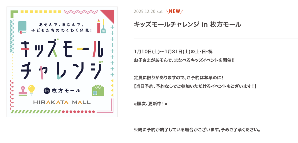 枚方モールの公式サイトを見てみると、遊んで学べるキッズイベントを開催するということが書かれています。