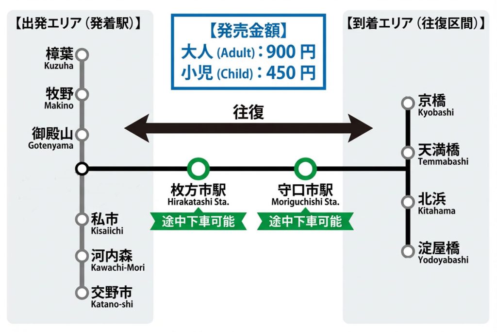 ソースは公式リリース。現在発売中の「京阪電車 交野線大阪方面往復きっぷ(枚方市駅お立寄りきっぷ)」をリニューアルした新商品とのこと。