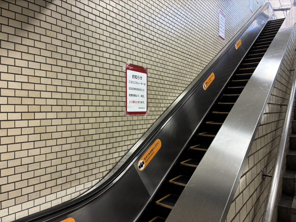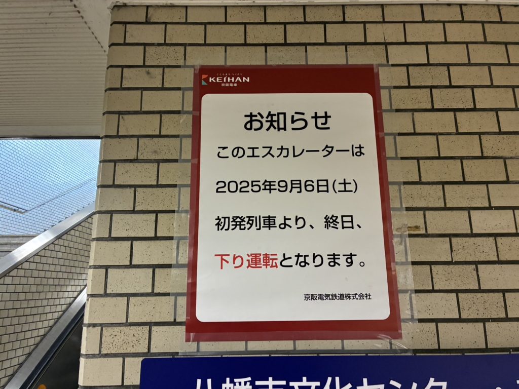 現地にあったお知らせ。9月6日の始発列車から今まで上りだったエスカレーターが、終日下り運転になるそう。大阪方面行きのエスカレーターですね。