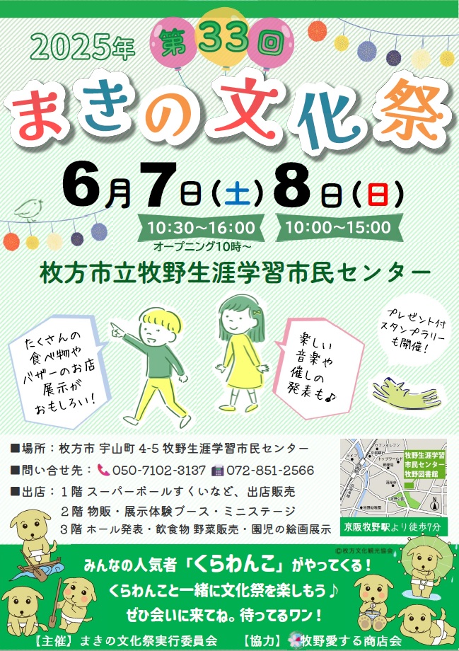 公式サイトや上記によると、6月7日・8日に牧野生涯学習市民センターで「第33回 まきの文化祭」が開催されるとのこと。