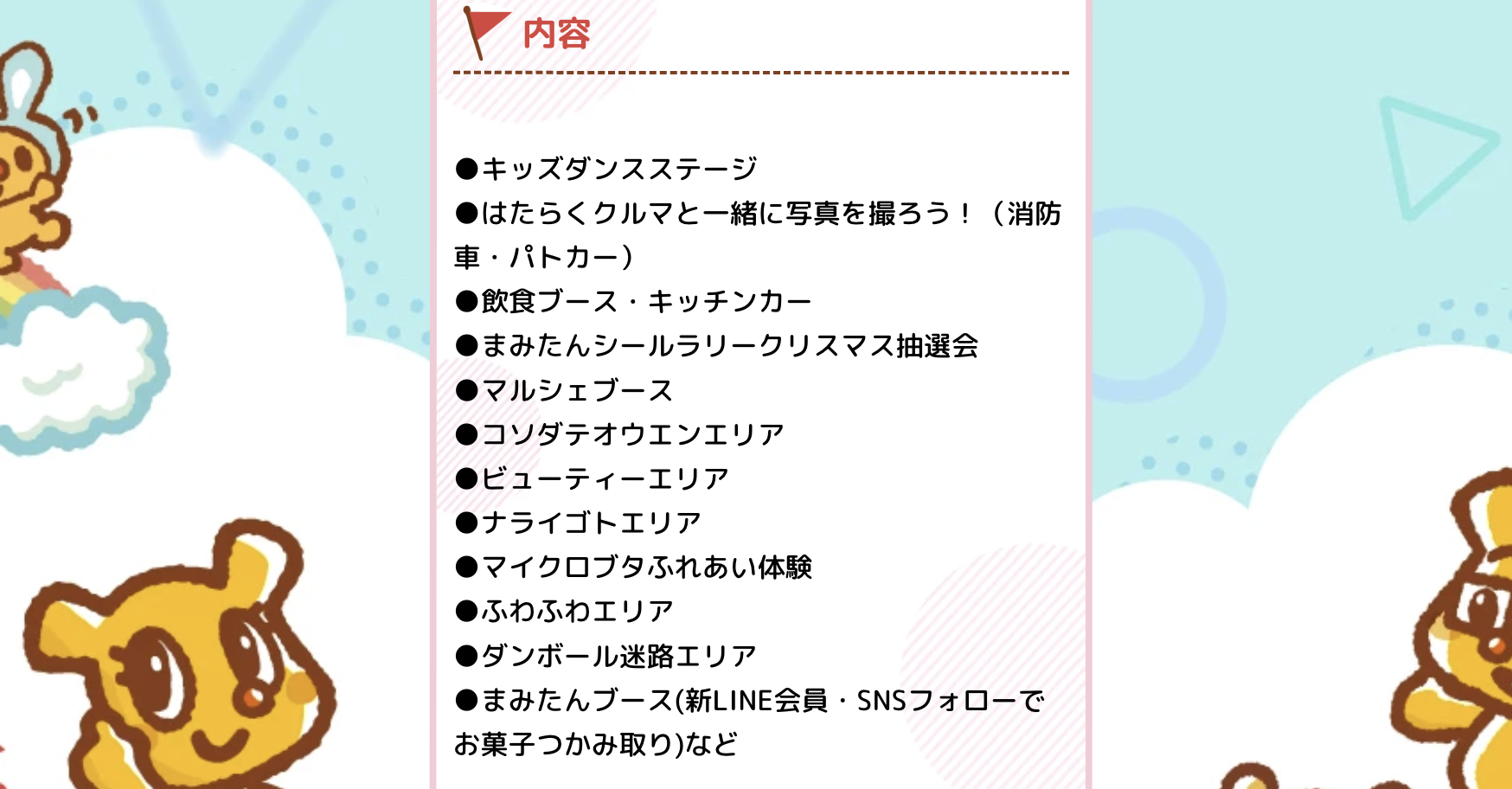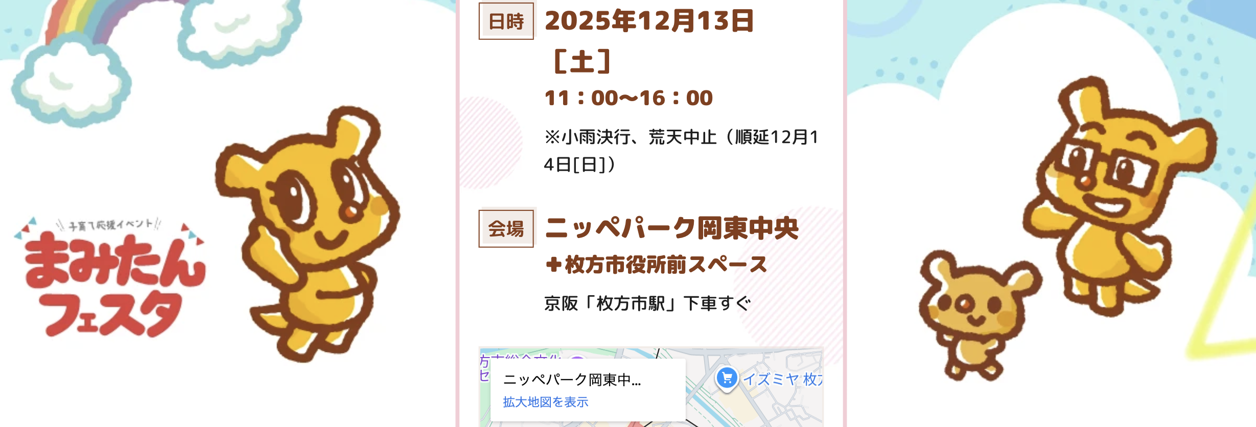 まみたんフェスタの公式ホームページを見てみると、ニッペパーク岡東中央で「まみたんフェスタ」が開催されるということが書かれています。