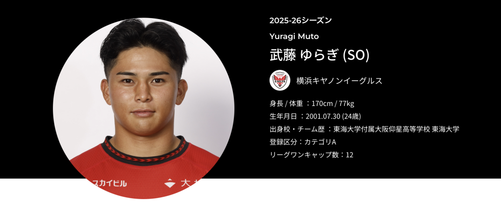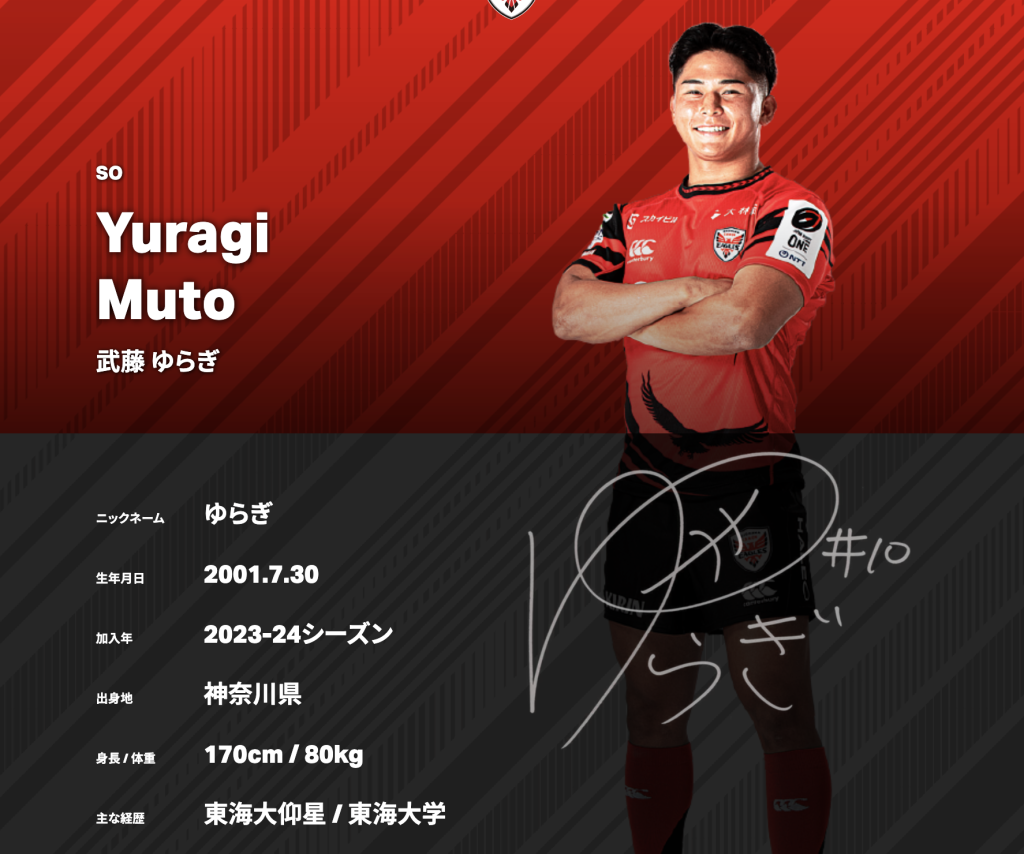武藤選手は2023-24シーズンに横浜キヤノンイーグルスに加入しており、ポジションはスタンドオフ。
