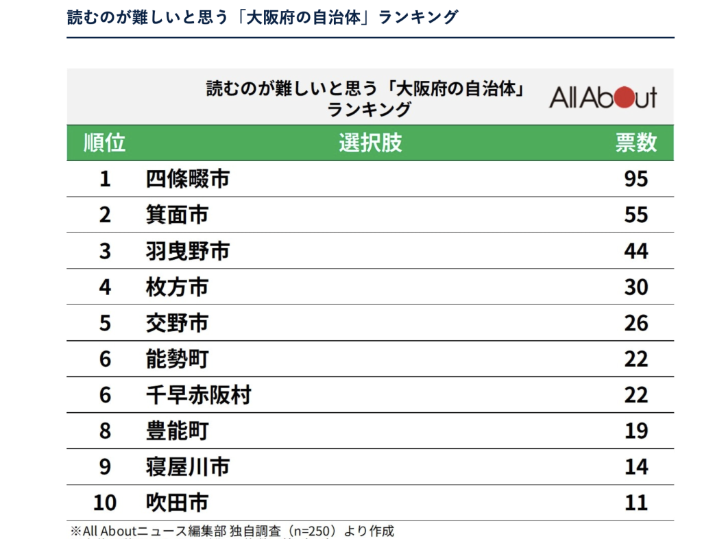 All About ニュース「読むのが難しいと思う『大阪府の自治体』ランキング」に枚方市がランクインしています。