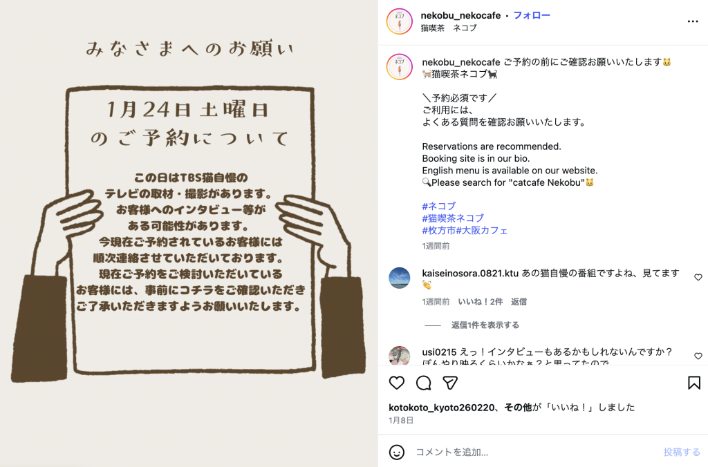 Instagramによると、1月24日にTBSねこ自慢のテレビの取材・撮影があることがわかります。お客さんへのインタビューなどがある可能性があるとのこと。