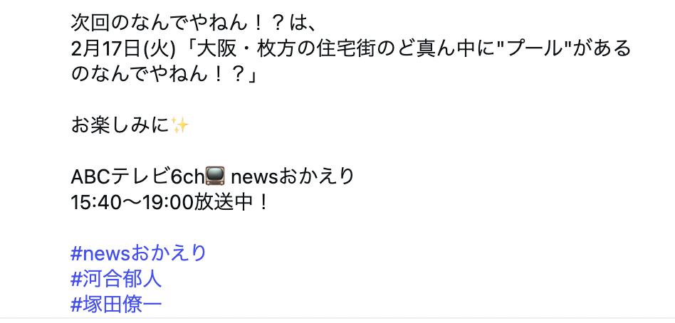 番組のInstagramによると、河合郁人さん、A.B.C-Zの塚田僚一さん、ABCテレビアナウンサー福井治人さんが出演するコーナー「なんでやねん!?」で、枚方が紹介されるとのこと。