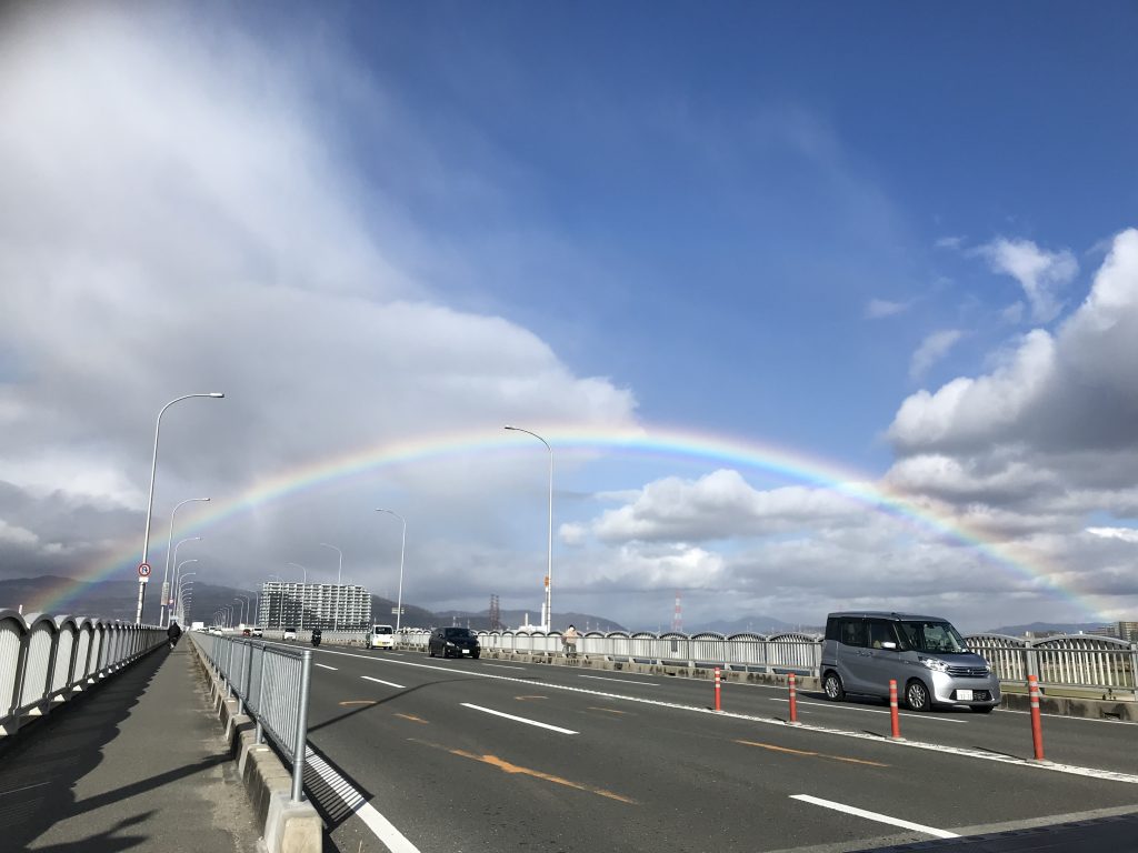 本日の虹の記事についてですが、河川敷を原付で爆走し高槻方面へ合流したところで撮影しましたら長く見えましたよ☆寒いし微妙に雨降ってるしで行こうか行くまいか悩みましたが行ってなかったなぁと得した気分になりました(^^)☆ (どの写真も車等通行されてる方が映ってしまっておりすみません!)
