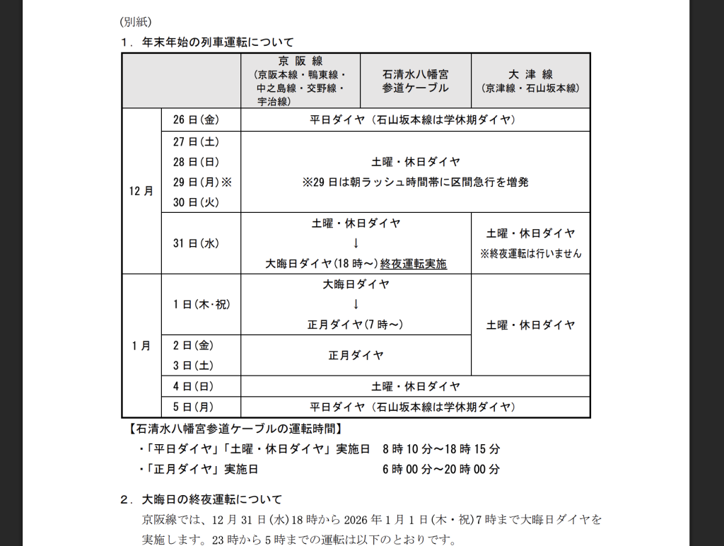 年末年始の予定に合わせて、京阪電車の動きもチェックしておくと安心かもしれませんね!