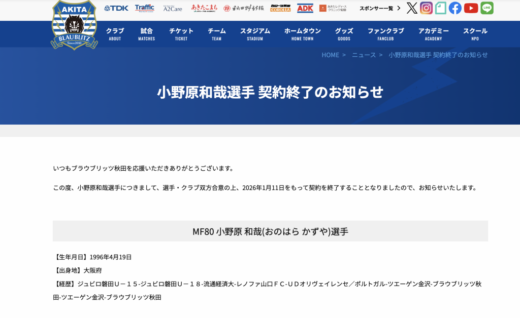 ブラウブリッツ秋田の公式サイトによると、2026年1月11日をもって契約を終了したとのこと。契約終了後の進路については、現時点ではわかりませんでした。