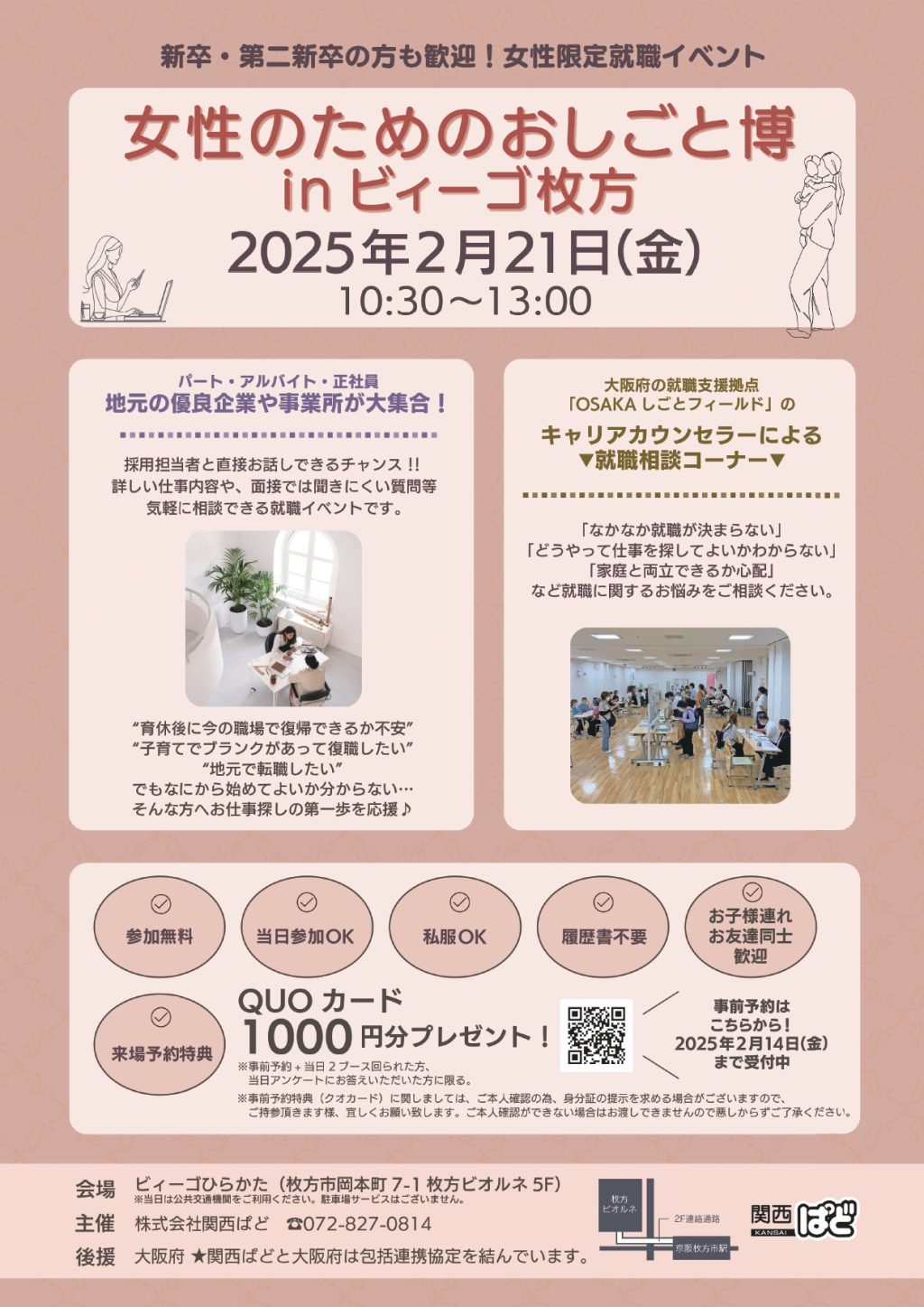 2月21日(金)の10:30~13:00に、枚方ビオルネ5階の「ビィーゴ枚方」で『女性のためのおしごと博inビィーゴ枚方』が開催されるとのこと。
