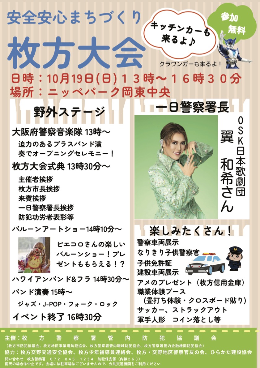 いただいた案内によると、枚方警察署管内防犯協議会が主催する「安心安全まちづくり 枚方大会」というイベントが開催されることが書かれています。