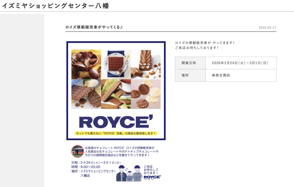 上記によると、2月24日~3月1日に「ロイズ移動販売車」がやってくることがわかります。販売時間は9:00〜20:00、場所は東側玄関前とのこと。