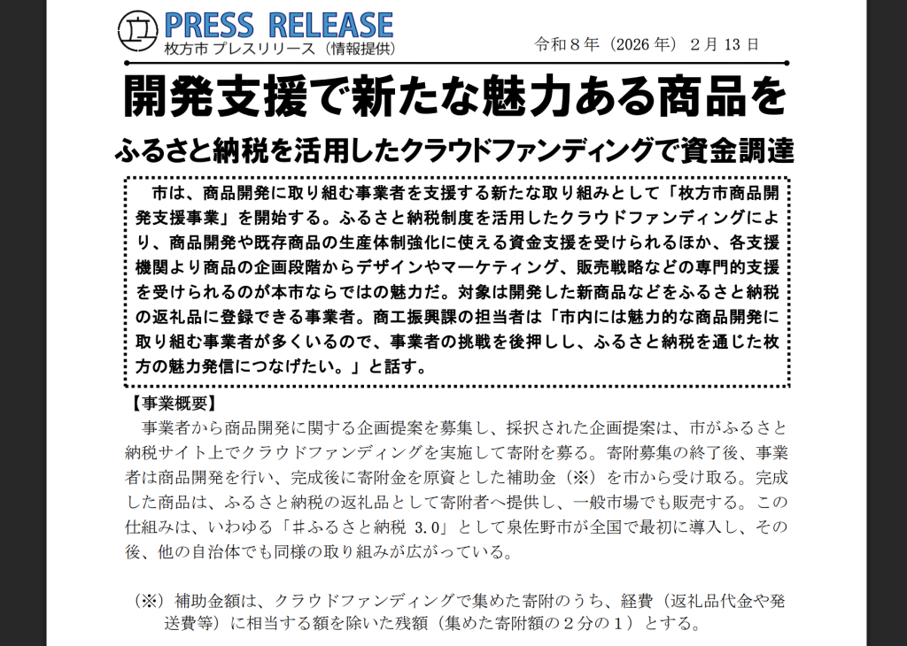 枚方市プレスリリースによると、ふるさと納税制度を活用した新たな取り組みとして、市内事業者の商品開発を支援する事業を実施するとの発表がありました。