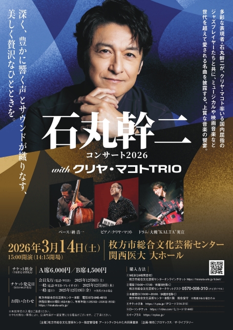 ミュージカルのみならず、ドラマ、映画でも数多くの作品に出演し、また最近ではオーケストラとのコンサートなど、まさに多彩な分野で活躍する石丸幹二が『石丸幹二 コンサート2026 with クリヤ・マコトTRIO』と題して枚方にやってきます。