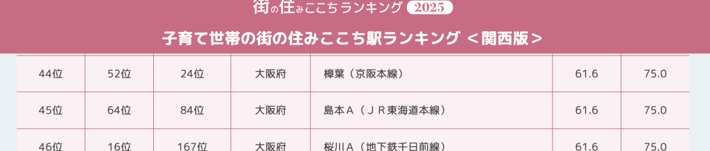 「子育て世帯の街(駅)の住みここちランキング」では、樟葉が44位にランクイン!