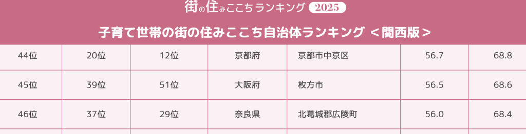 「子育て世帯の街(自治体)の住みここちランキング」では、枚方市が45位にランクインしていました。