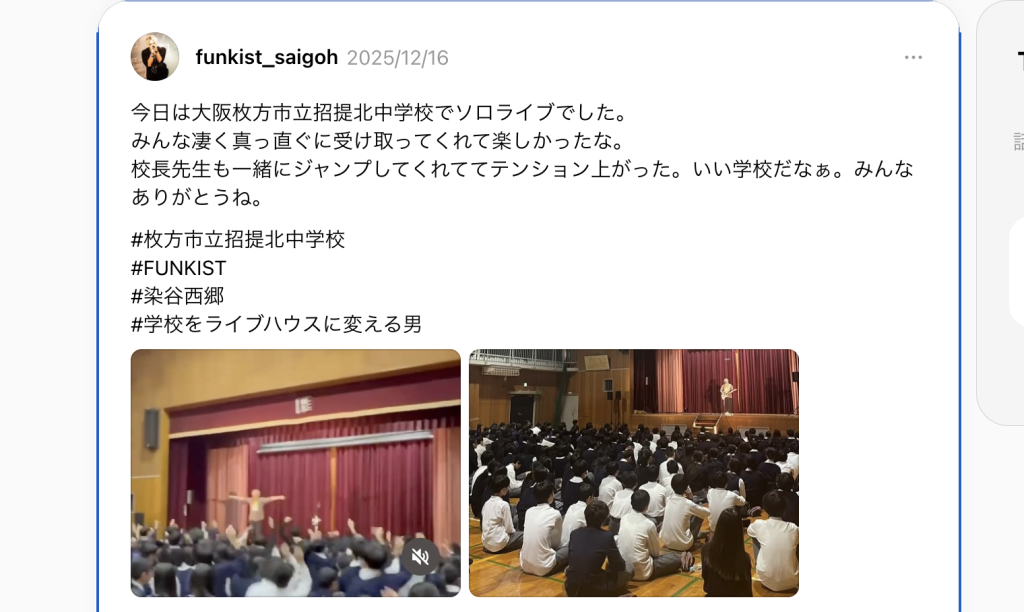 染谷西郷さんのthreadsの投稿をみてみると、招提北中学校でソロライブが行われたことが書かれています。
