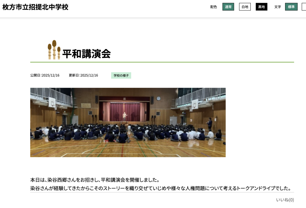 学校のホームページには染谷西郷さんが平和講演会を開催し、トークとライブを行ったことも書かれています。