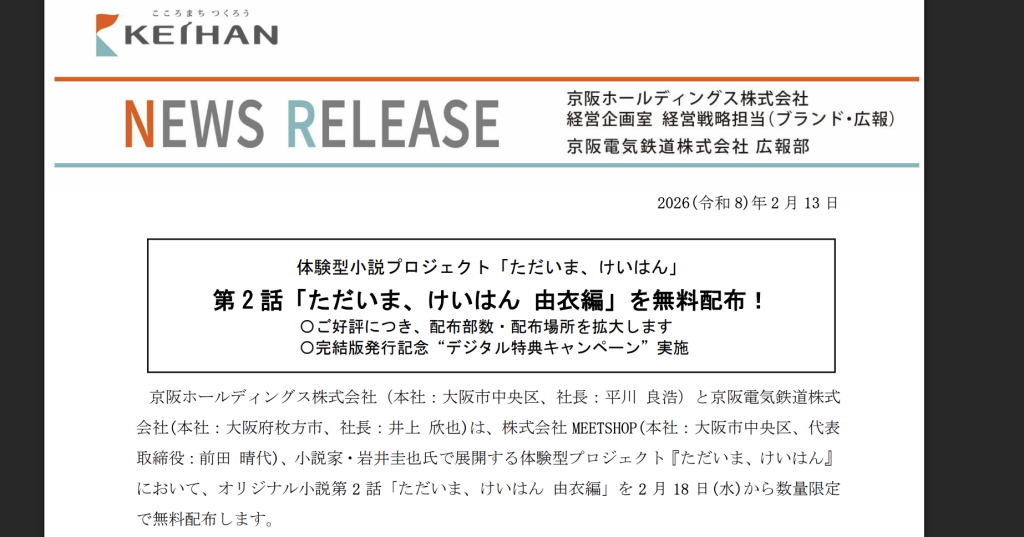京阪ホールディングス株式会社のニュースリリースを見てみると、小説「ただいま、けいはん」の第2話を数量限定で無料配布するということが書かれています。