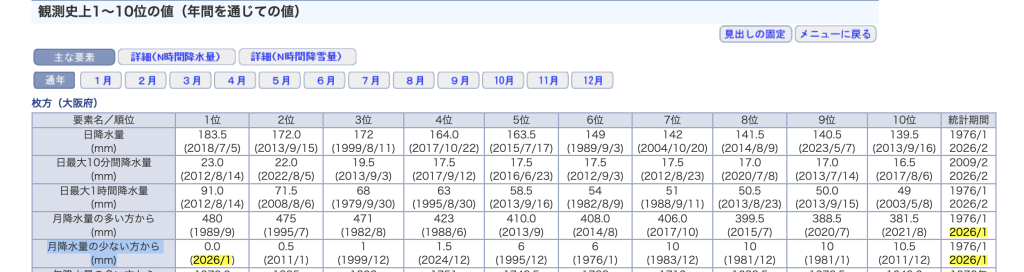 上記によると、2026年1月の枚方は、月降水量0.0mmで観測史上1番目の少なさだったことがわかります。1月の記録としても1番目の少なさでした。