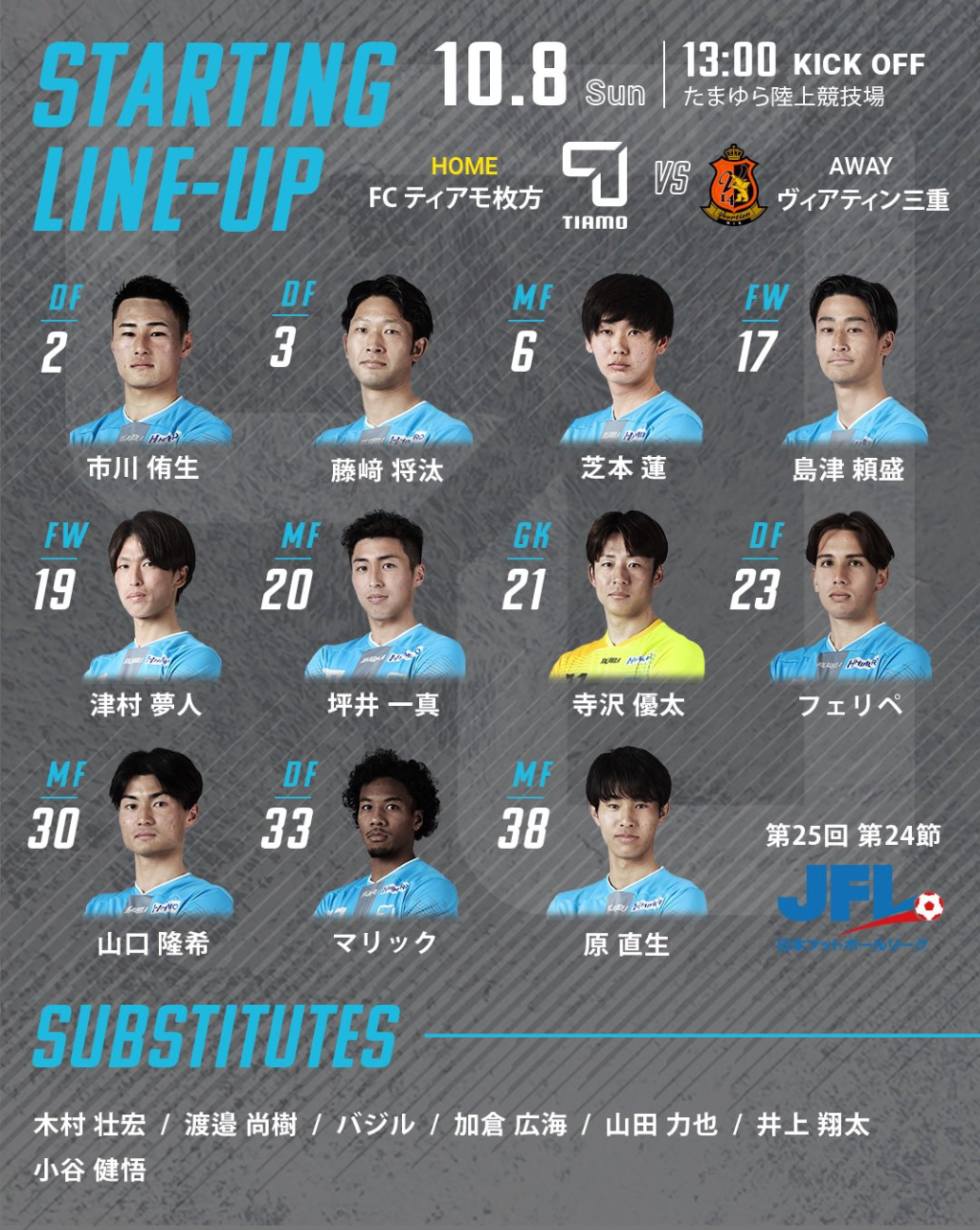枚方からJリーグを目指すサッカークラブ「FCティアモ枚方」の10月8日に行われたvsヴィアティン三重の試合結果をお届けします。