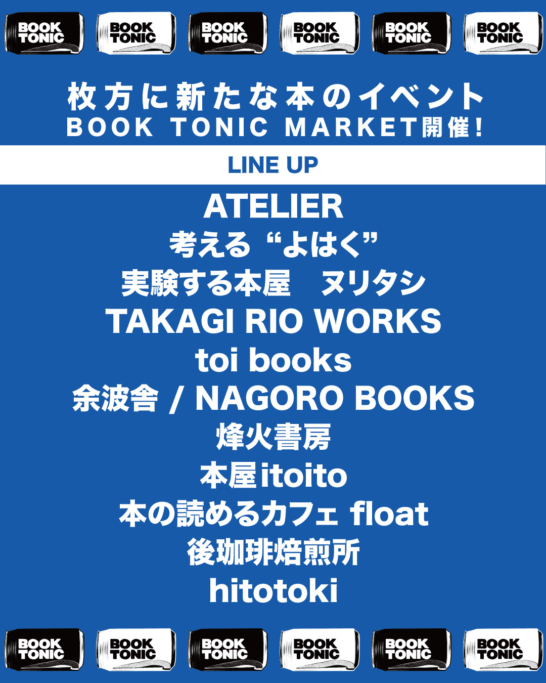 このイベントは、関西・関東の個性派書店8組+枚方の人気カフェ3店舗が集うもので、「日々を懸命に生きる人へ、小さな“活力=トニック”を本を通して届けたい」という思いが込もった本のマーケットなんだとか。