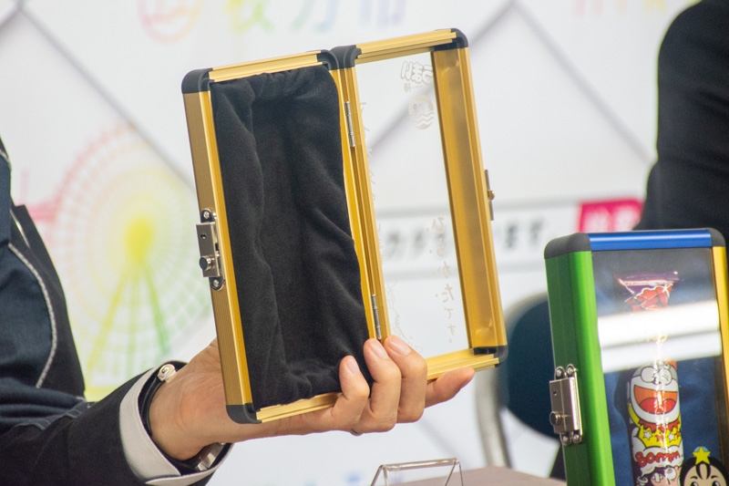 上記写真の左から「ひらかた万博モデル(9万9千円)」「ひこぼしくんモデル(11万円)」「枚方モデル(9万9千円)」ケース本体とカギ、写真のようにディスプレイできる台座の3点セット。