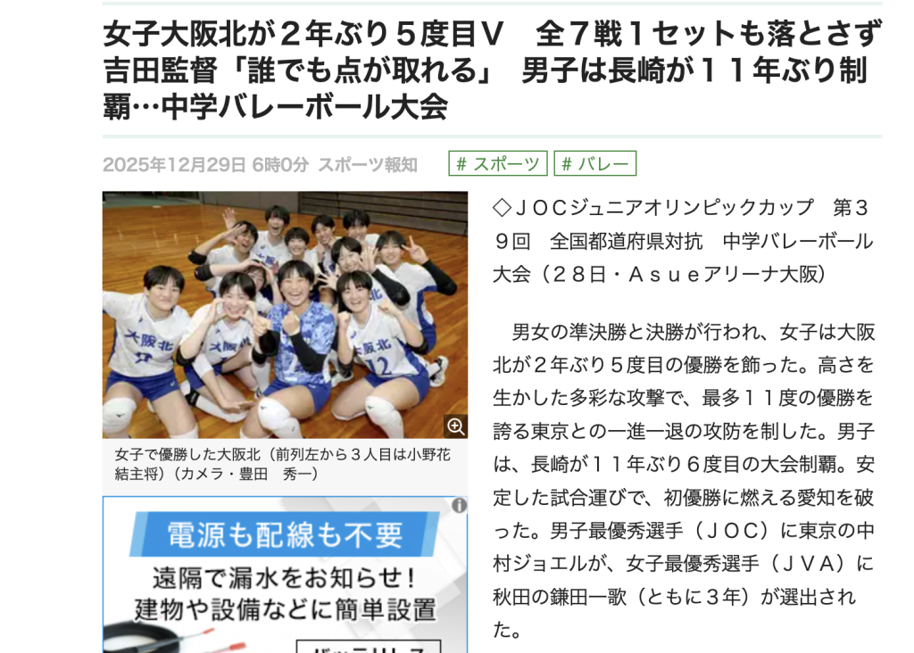 「スポーツ報知」の記事を見てみると、中学生選抜による全国大会「JOCジュニアオリンピックカップ 第39回全国都道府県対抗 中学バレーボール大会」の女子の部で、大阪北選抜チームが優勝したということが書かれています。