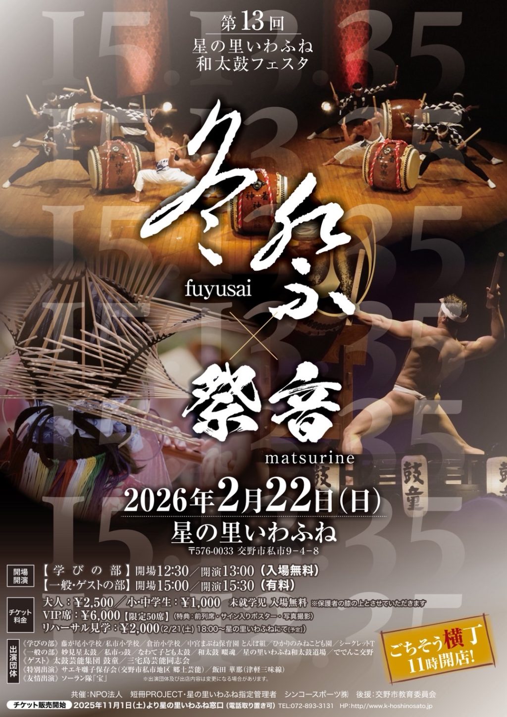 お隣の交野市「星の里いわふね」で2月22日(日)に『第13回 星の里いわふね 和太鼓フェスタ』が開催されます。