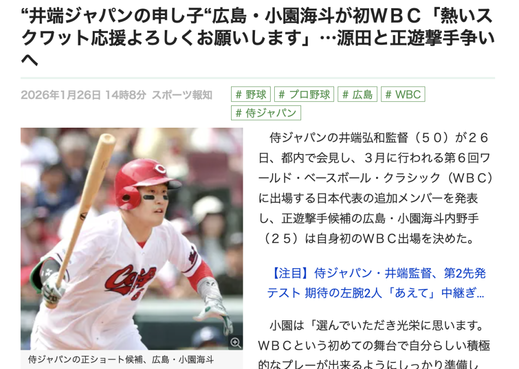 スポーツ報知によると、「第6回 ワールド・ベースボール・クラシック(WBC)」のメンバーに小園選手が選ばれたことがわかります。小園選手がWBCに出場するのは今回が初めて。