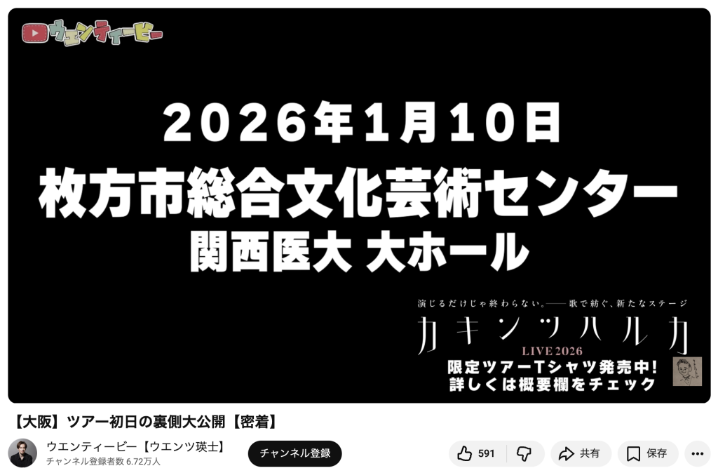 総合文化芸術センターで行われた『カキンツハルカ LIVE 2026』の舞台裏映像がウエンツ瑛士さんのYouTubeチャンネルで公開されています。