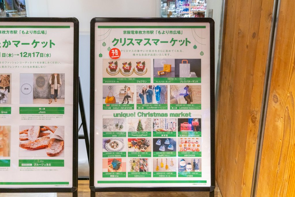看板によると、枚方市駅中央改札前の「もより市広場」で、クリスマスマーケットが行われる模様。
