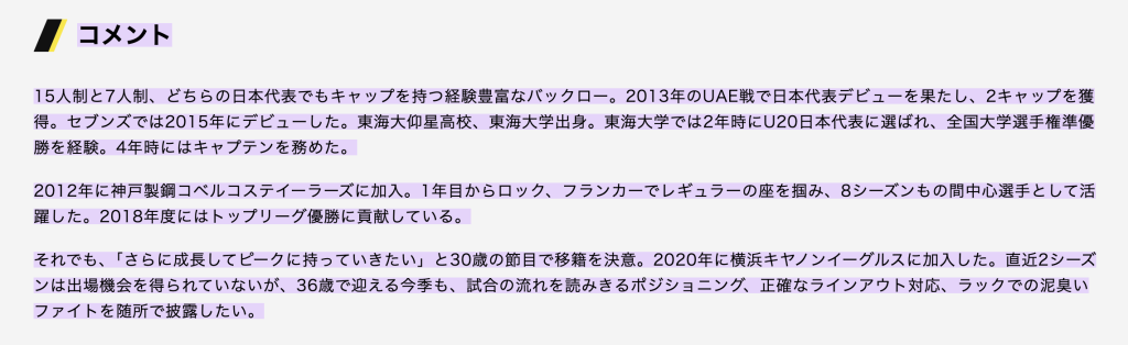 JSPORTSによると、安井選手は15人制と7人制どちらの日本代表でも公式戦に出場した経験があるのだとか。2012年に神戸製鋼コベルコスティーラーズ(現:コベルコ神戸スティーラーズ)に加入、2020年に横浜キヤノンイーグルスに加入したそうです。