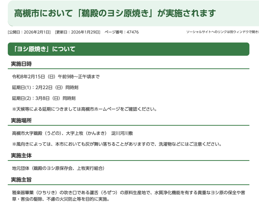 高槻で「鵜殿のヨシ原焼き」が実施されるようです。