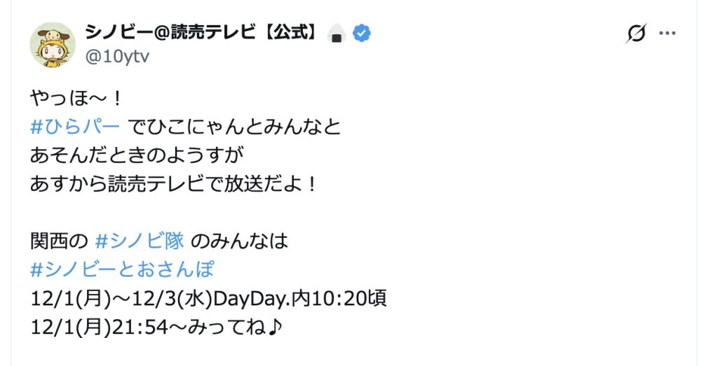 投稿によると、12月1〜3日の「DayDay.」内と、12月1日21時54分から「シノビーと、おさんぽ。」でひらパーでひこにゃんとシノビーが遊んだ時の様子が放送されるとのこと。