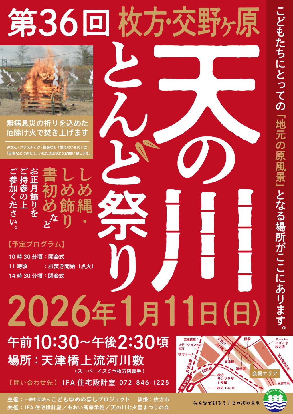 1月11日(日)に天津橋周辺で「天の川とんど祭り」が開催されるようです。