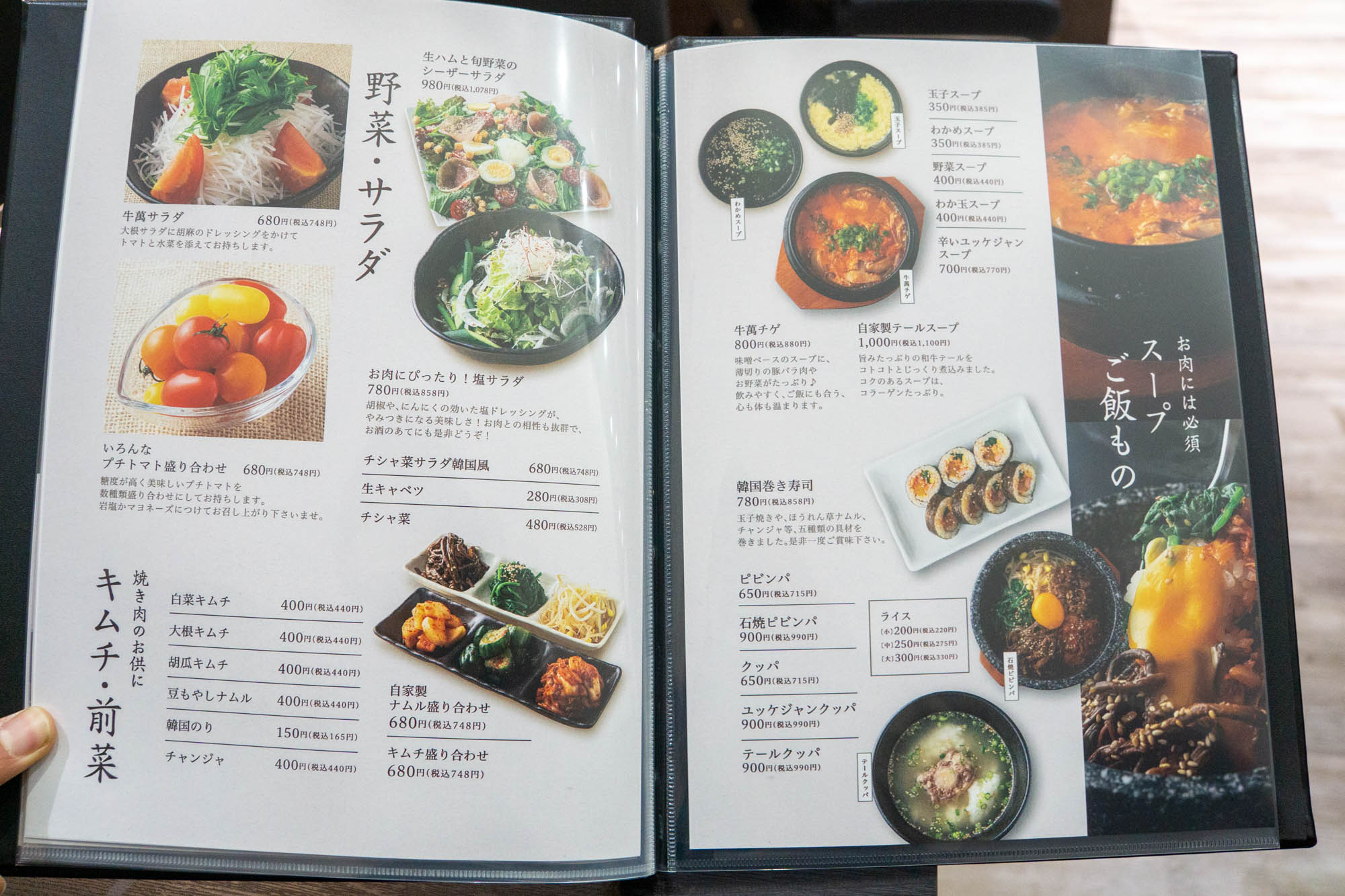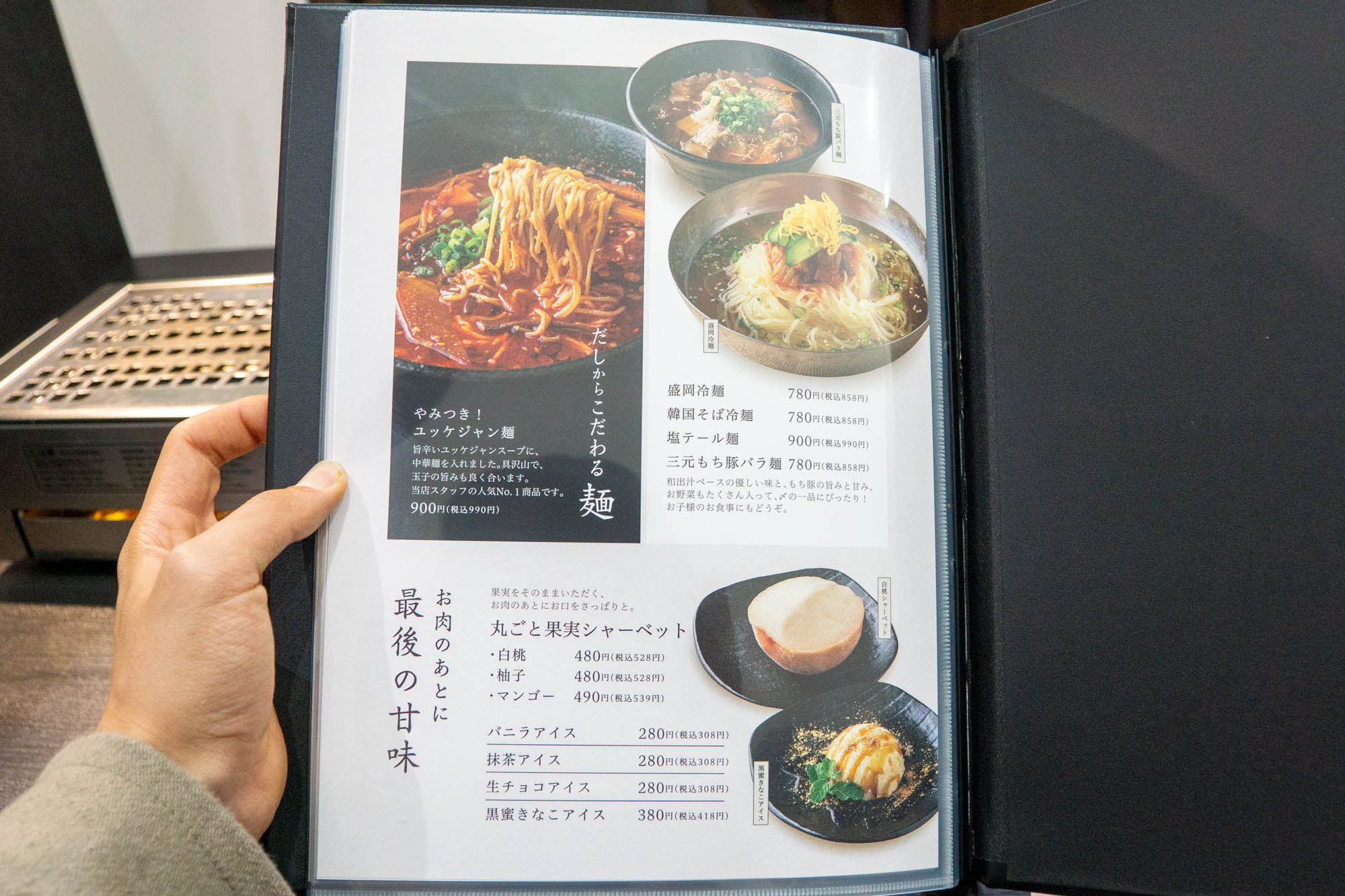 焼肉だけでなく冷麺、ユッケジャン麺、ビビンバ、肉刺しと色々よりどりみどりなメニュー。