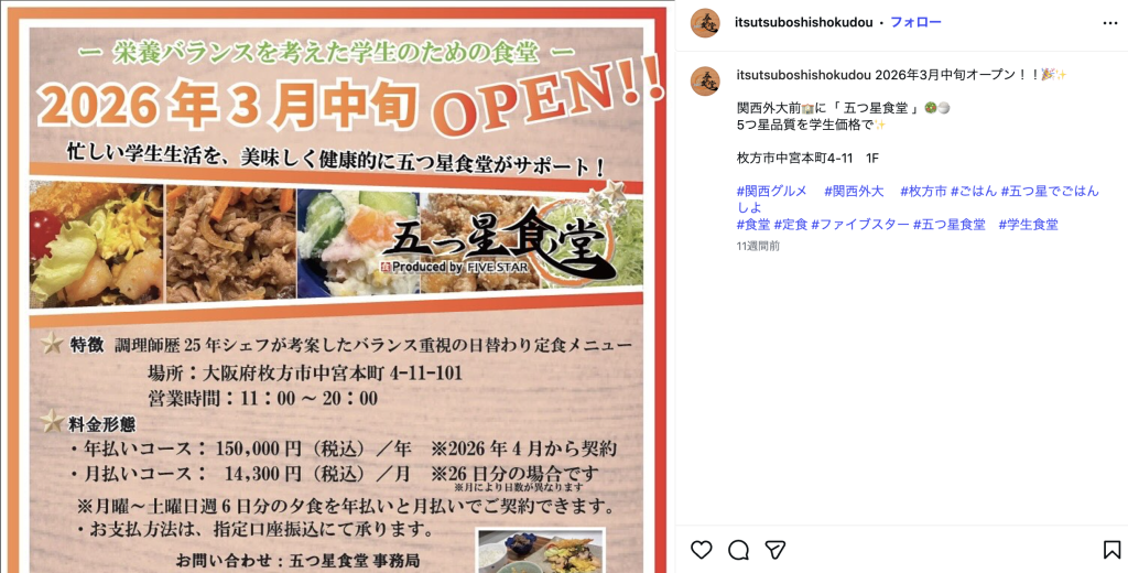 バランス重視の日替わりメニューが食べられる食堂が外大前にできるということで、外大生の方は特に重宝しそう!