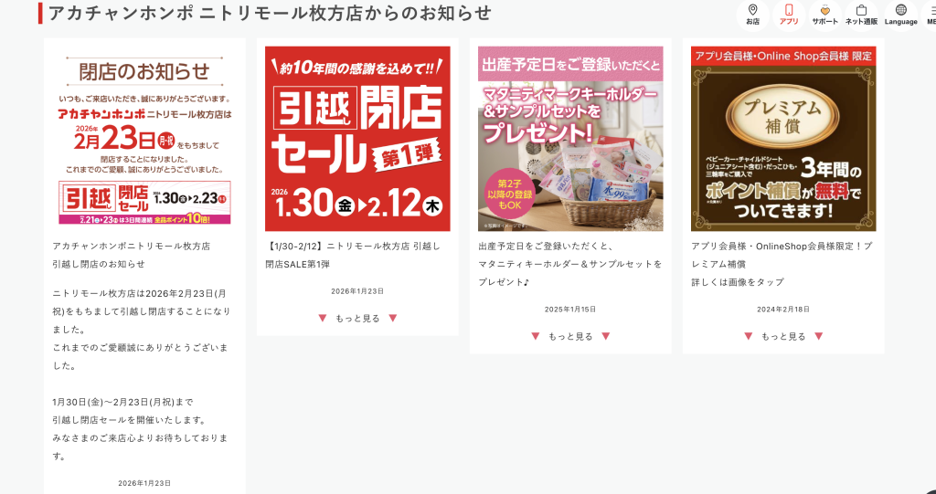 ニトリモール枚方の「アカチャンホンポ ニトリモール枚方店」が2月23日で引っ越しのため閉店するようです。