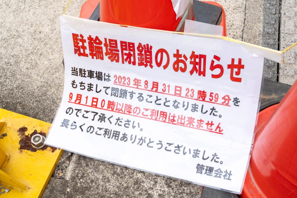 長尾駅東口近くのコイン式駐輪場「アップルパーク 長尾駅前駐輪場」が閉鎖されています。