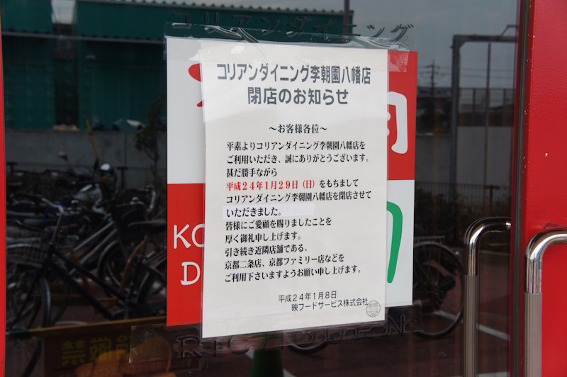 イズミヤ八幡店内の韓国料理店「李朝園」が閉店しています。