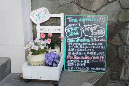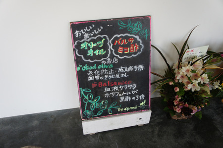 表にディスプレイされた黒板にオリーブオイルとバルサミコ酢の効能が書かれてます。