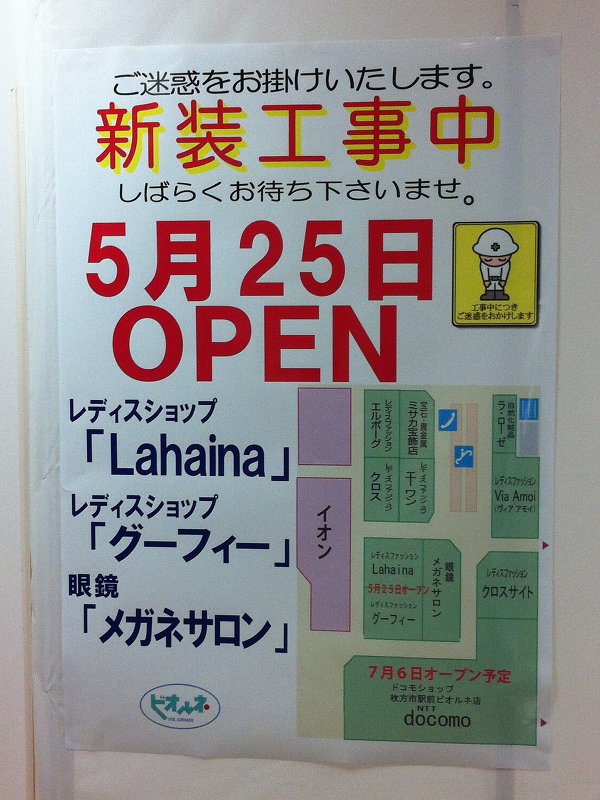 5月25日に「Lahaina」、「グーフィー」、「メガネサロン」がオープンして、7月6日にドコモショップがオープン予定とあります。メガネサロンって前に見たときは3月中旬オープンって書いてあったんですけど延びてたんでしょうか。
