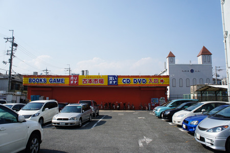 Soleilの正面には古本市場の駐車場。右の建物がメガネの三城。