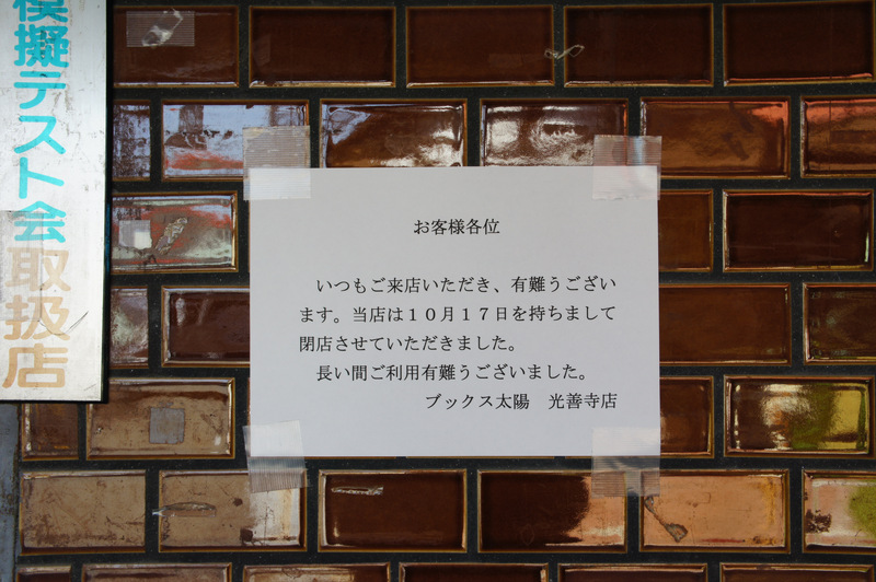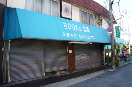 10月17日で閉店したそうです。「光善寺店」と書いてあるので他にお店があるのかと思って検索してみたら「ブックス太陽 門真店」というのが出てきました。ただGoogleストリートビューで見てみてもお店が見当たらなかったのでそちらももうないのかもしれません。