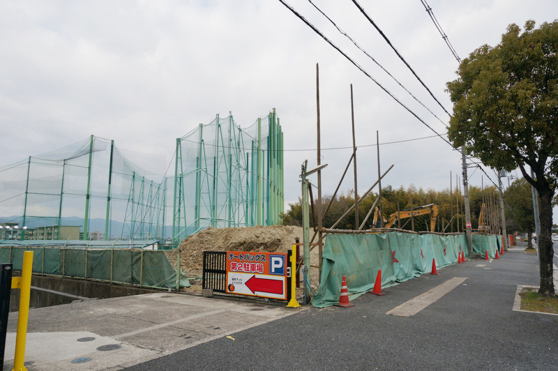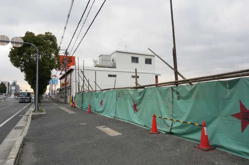 隣の「無害良品」などが並んでいたところが取り壊されることを記事にしたときにもオートバックス閉店については触れましたが、その取り壊しはもう終わってます。こちらまでオートバックスの敷地が広がるようです。工事の看板によると敷地面積は2583.26㎡、建築面積が971.03㎡。