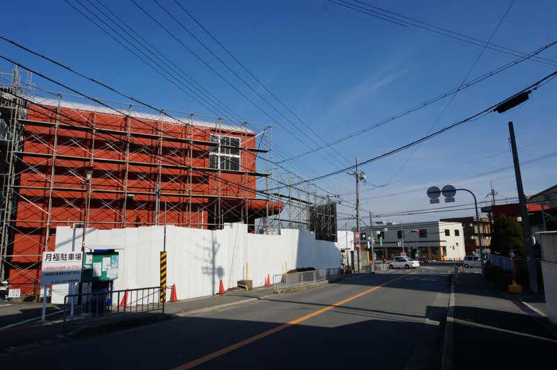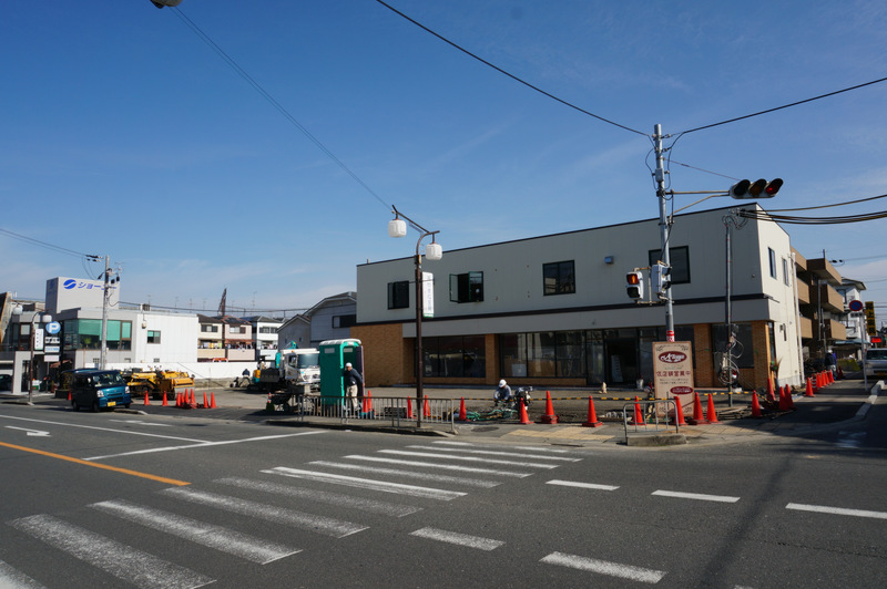こっちに行くとローソンやひらつーではおなじみの「三吉なんでもストアー」の前を通って国道1号線の家具団地前交差点へ。向かいにも工事の囲いがされてますが…